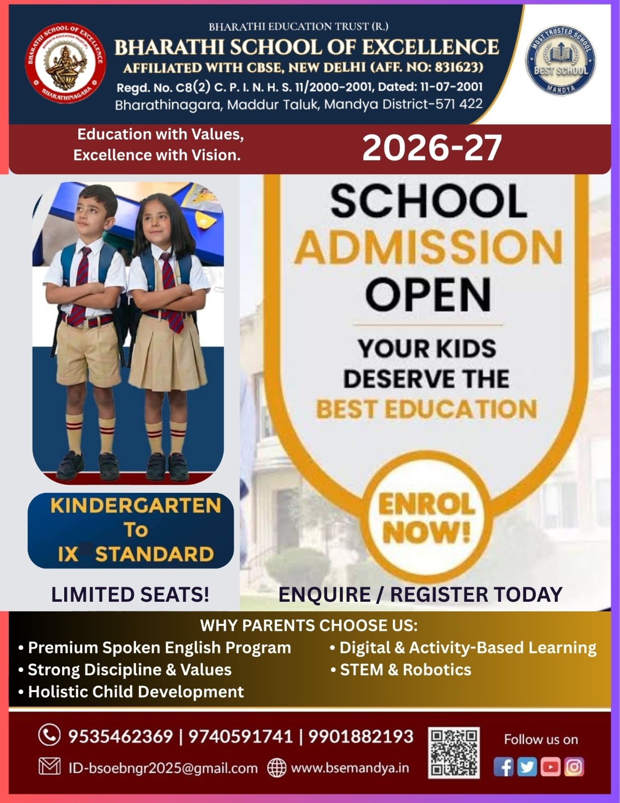 Bharathi School of excellence, under the aegis of Bharathi education Trust, has been a beacon of academic excellence since 2011. Nestled in the heart of Bharathinagara Maddur taluk, Mandya district, our institution has consistently achieved outstanding results and earned a reputation for exceptional teaching standards.